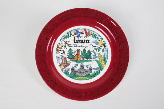 Souvenir Plate of Iowa, The Hawkeye State, Edged With Victorian Burgundy and Gold